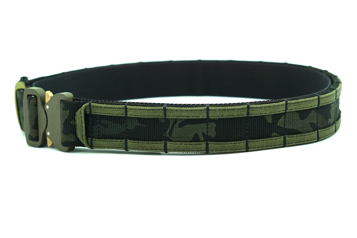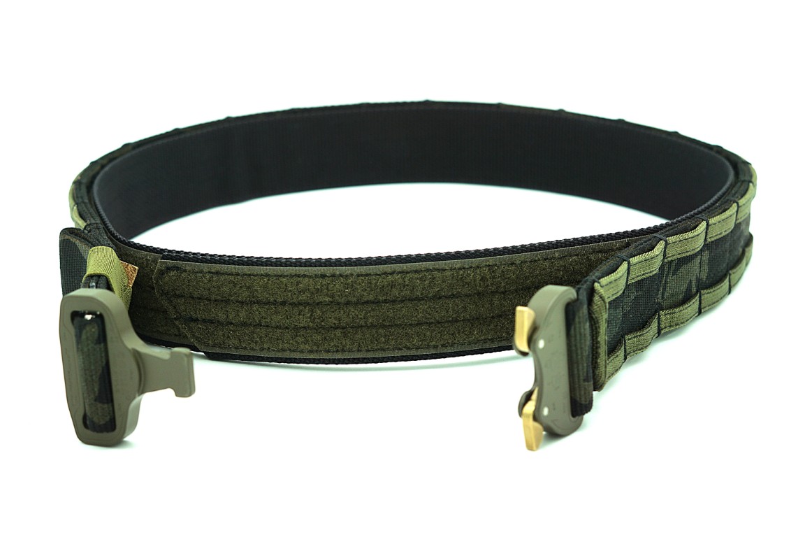 Dwuczęściowy pas taktyczny 45 mm MultiCam® Black / Ranger Green wykonany z taśmy Nylon Webbing Type 13 Class 1a (MIL-W-4088) firmy MMI Textiles, zapewniający wysoką sztywność i stabilność w wymagających warunkach. Wyposażony w metalową klamrę Cobra® Pro Style AustriAlpin, gwarantuje trwałość, bezpieczeństwo oraz niezawodne przenoszenie oporządzenia.