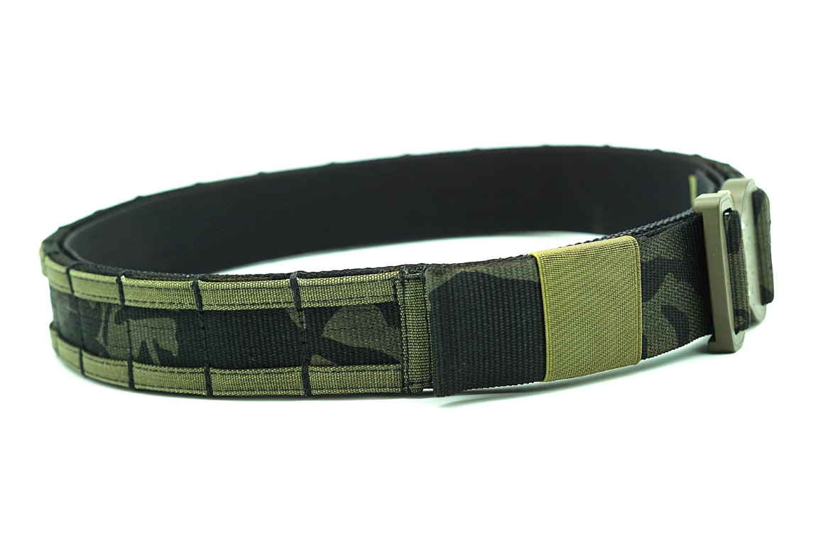 Dwuczęściowy pas taktyczny wykonany z podwójnie złożonej taśmy Nylon Webbing Type 13 Class 1a MultiCam® Black – 45 mm (1.75″) firmy MMI Textiles (specyfikacja MIL-W-4088).