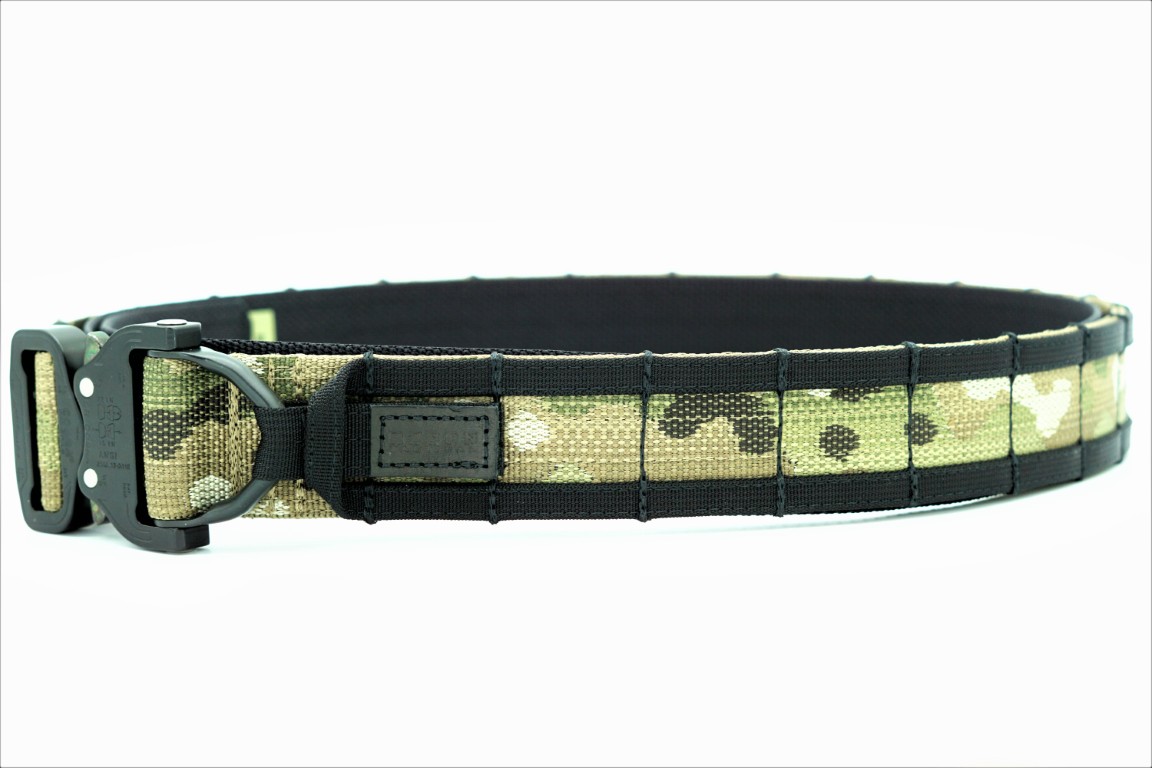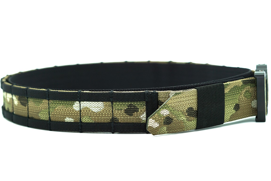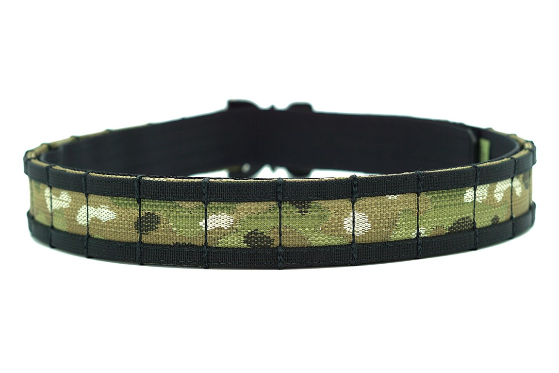 Pas zewnętrzny wykonany z podwójnie złożonej taśmy Nylon/Polyester Deployment Belt MultiCam® Original o szerokości 44 mm (1.75″), grubości 2,2 mm oraz wytrzymałości 1814 kg.