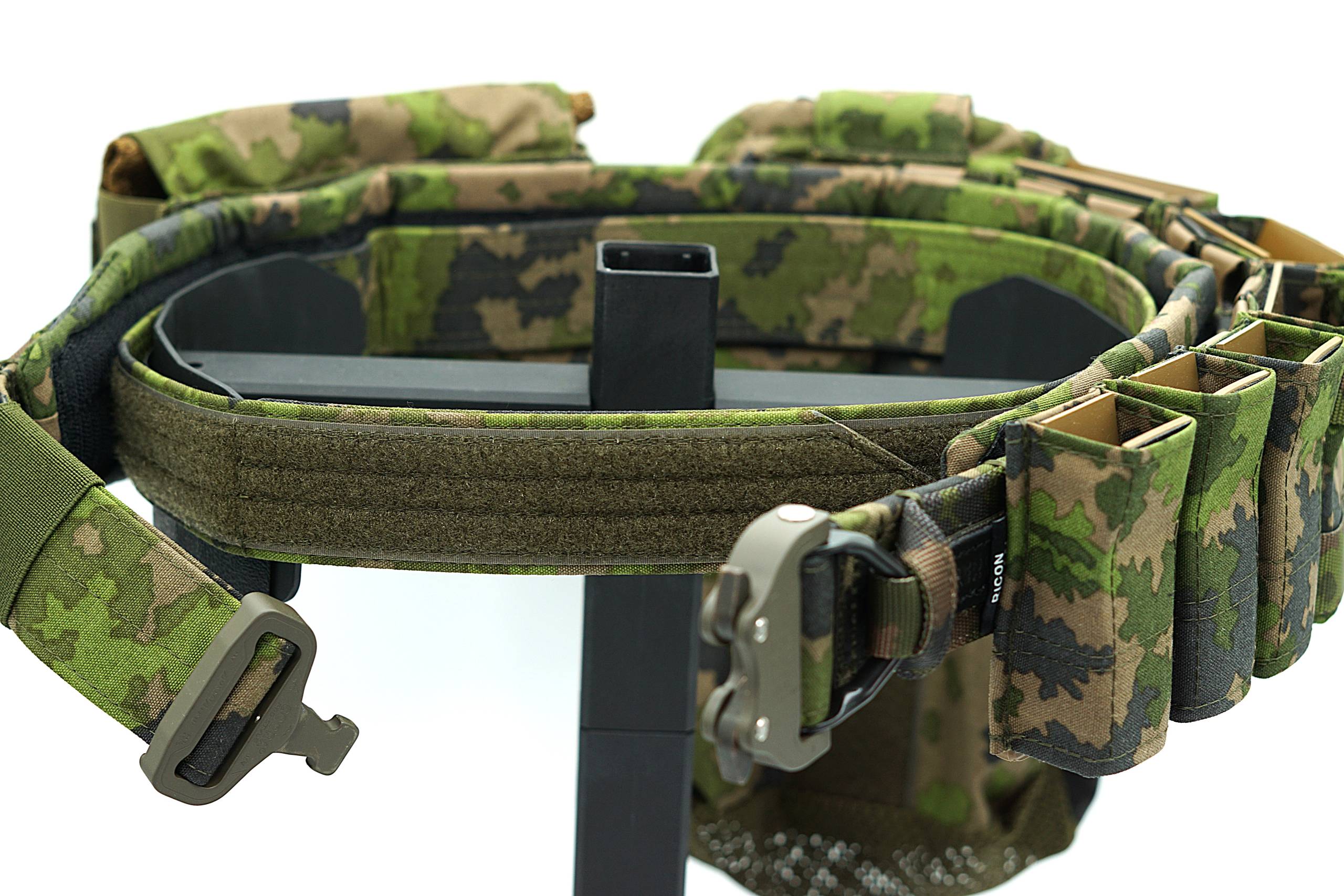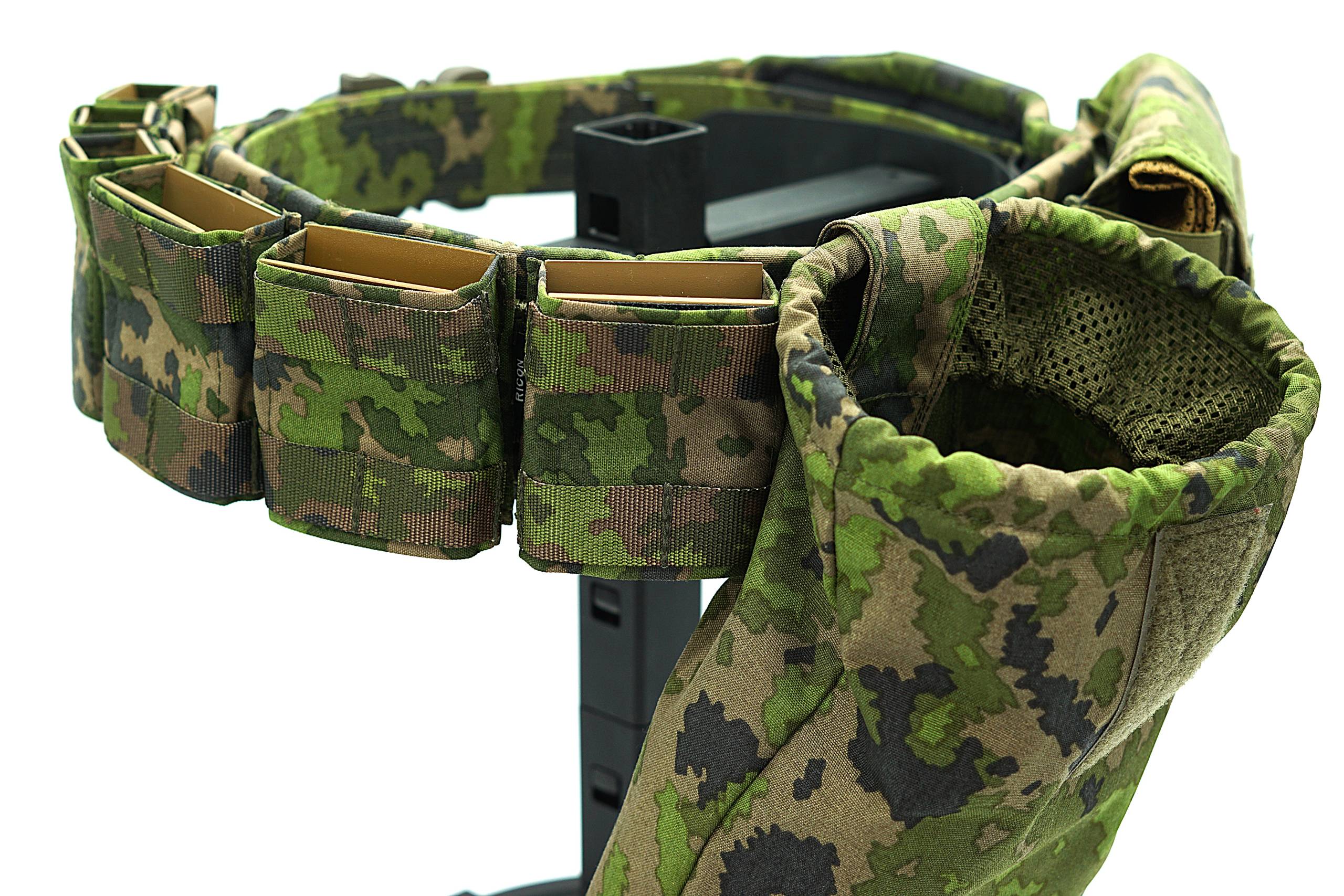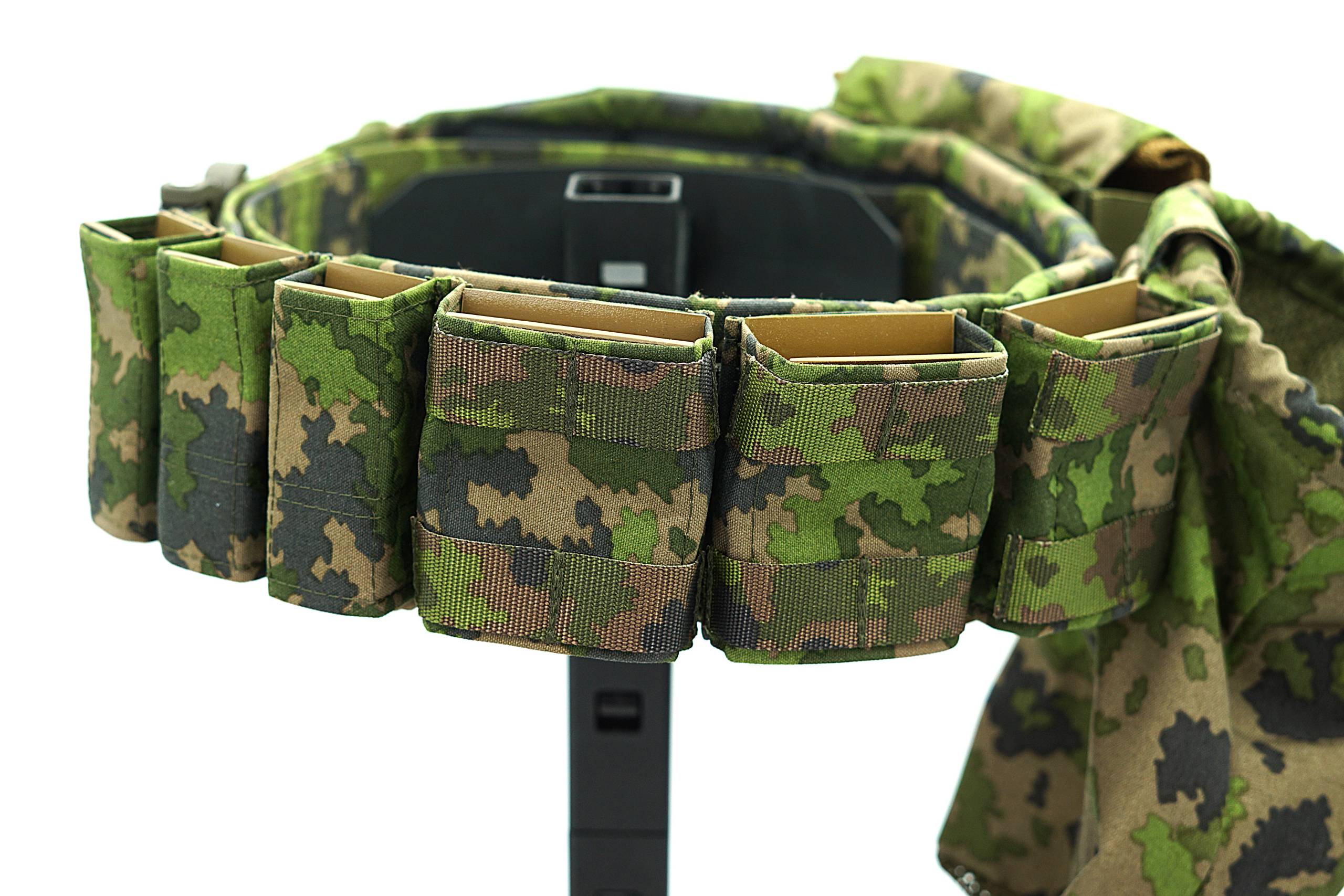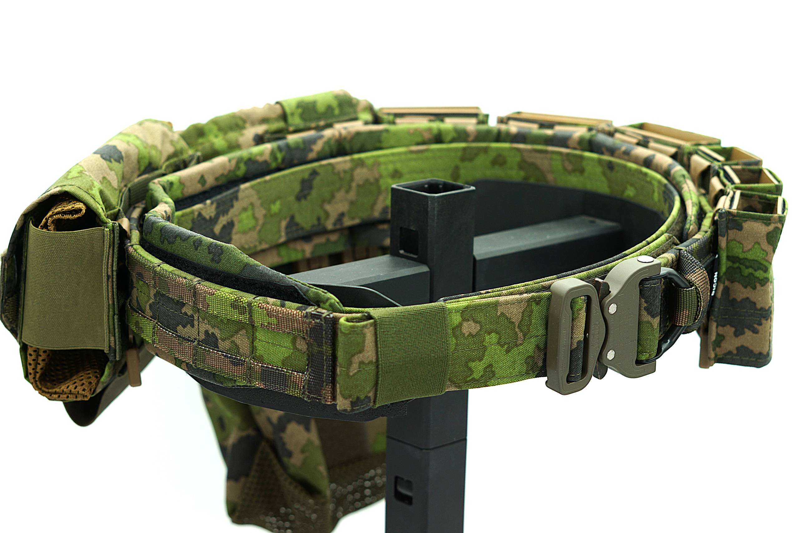 Pas zewnętrzny wykonany z podwójnie złożonej taśmy Pasamon TS309, dodatkowo obszyty Cordurą 500D FOXDURA PU-coated M05 Woodland Camo.