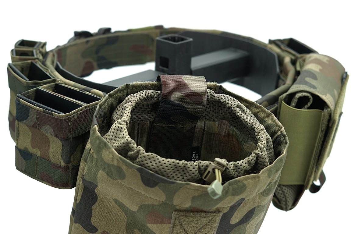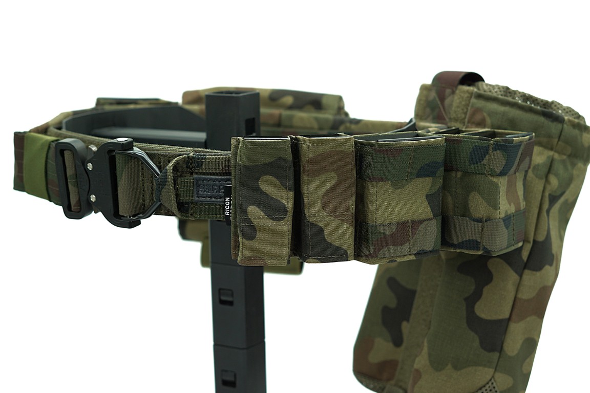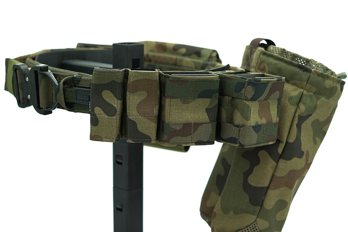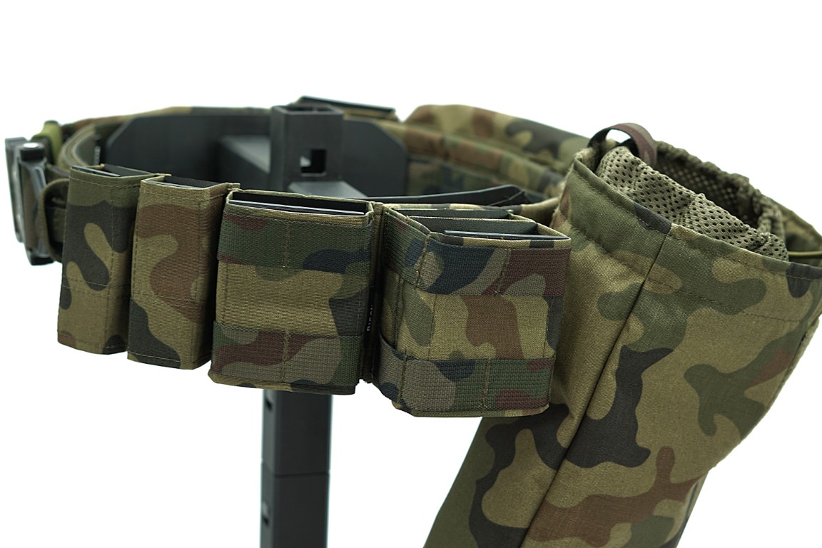 Na pasie naszyte są taśmy MOLLE tworzące sekcje PALS do montażu oporządzenia.